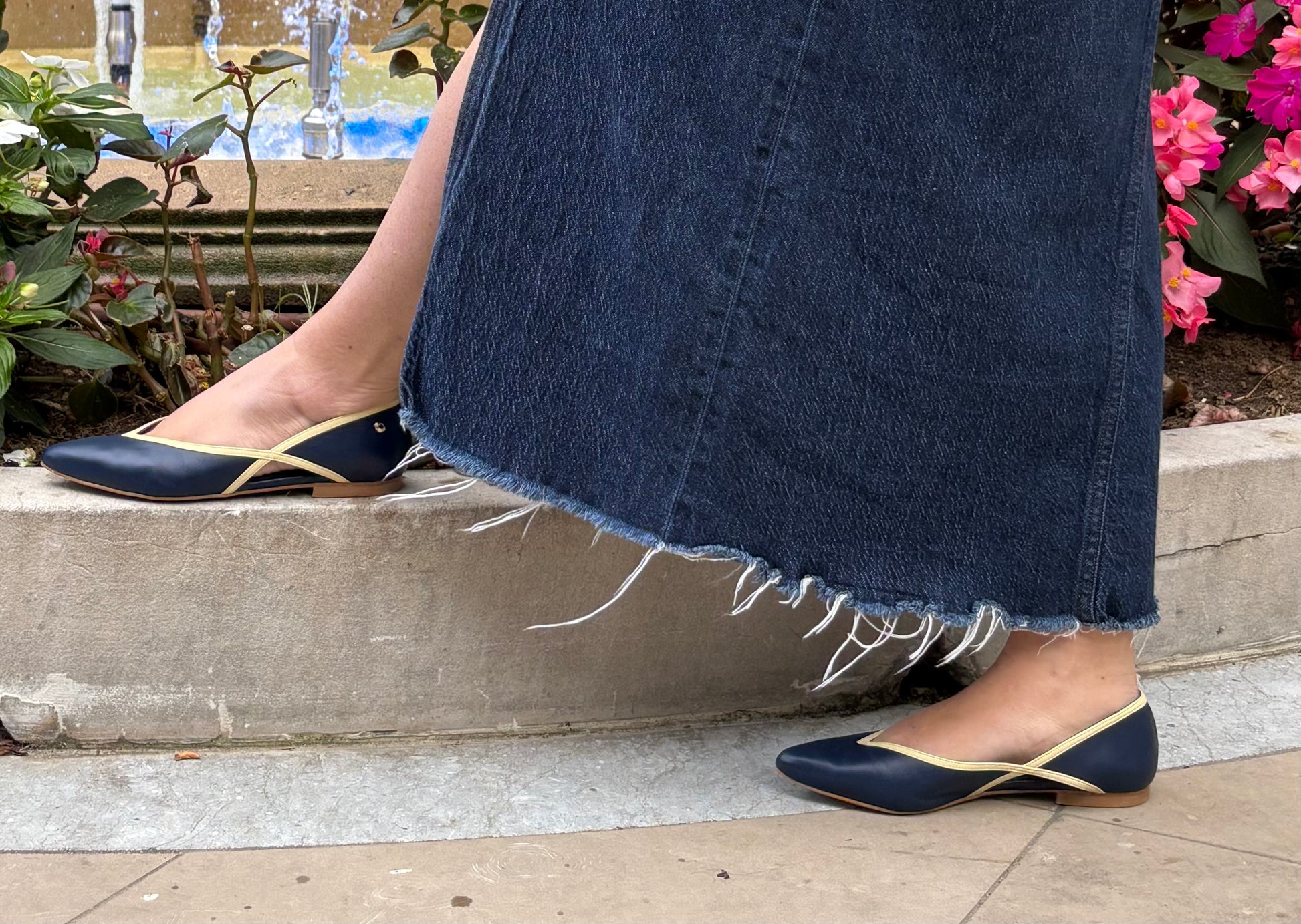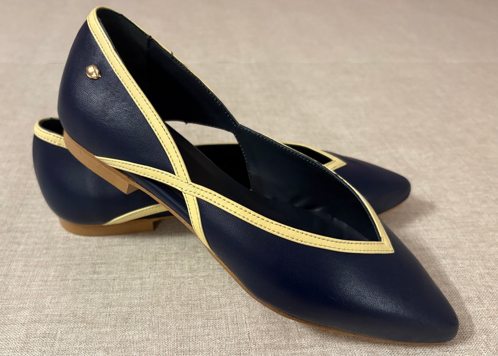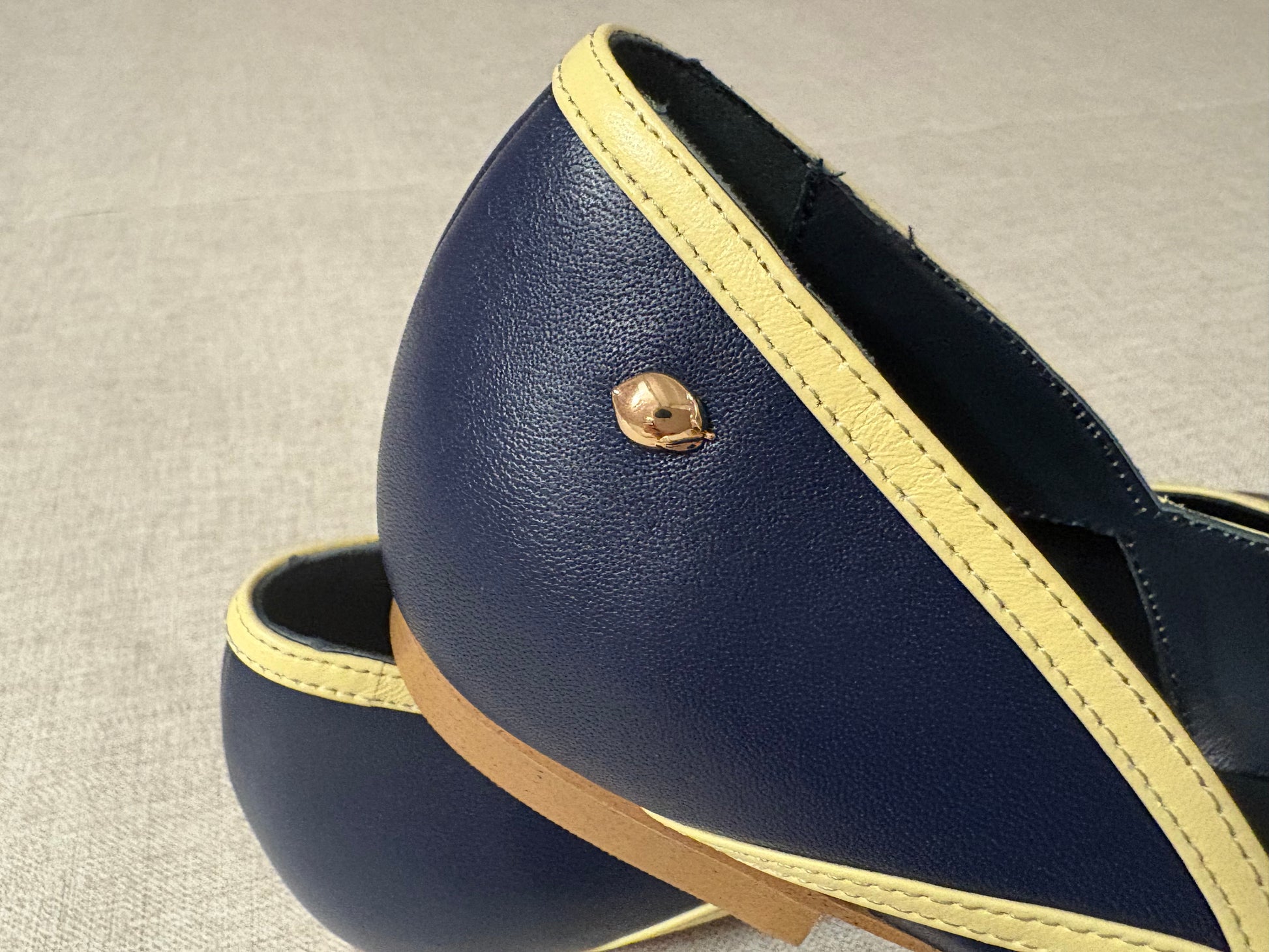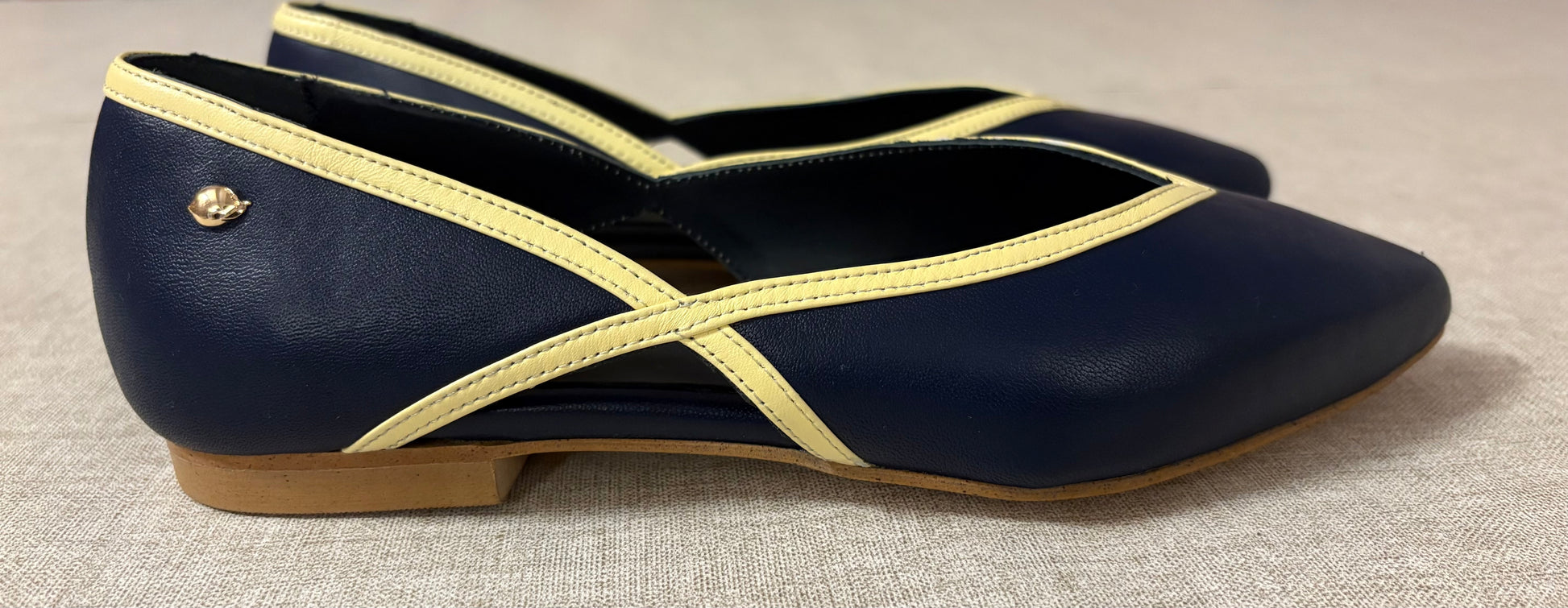 BAILARINA DE PIEL EN COLOR AZUL MARINO CON RIBETE EN AMARILLO MANTEQUILLA.