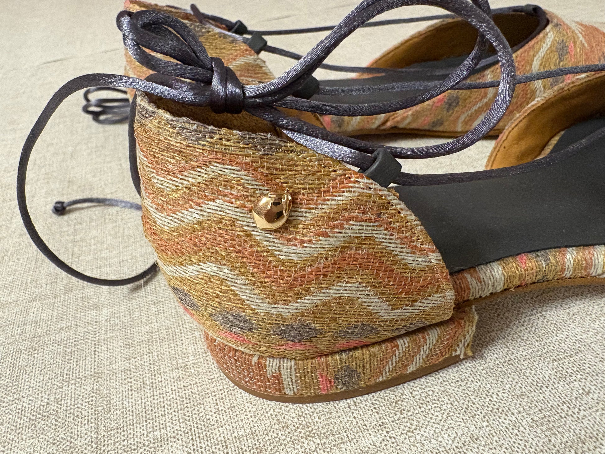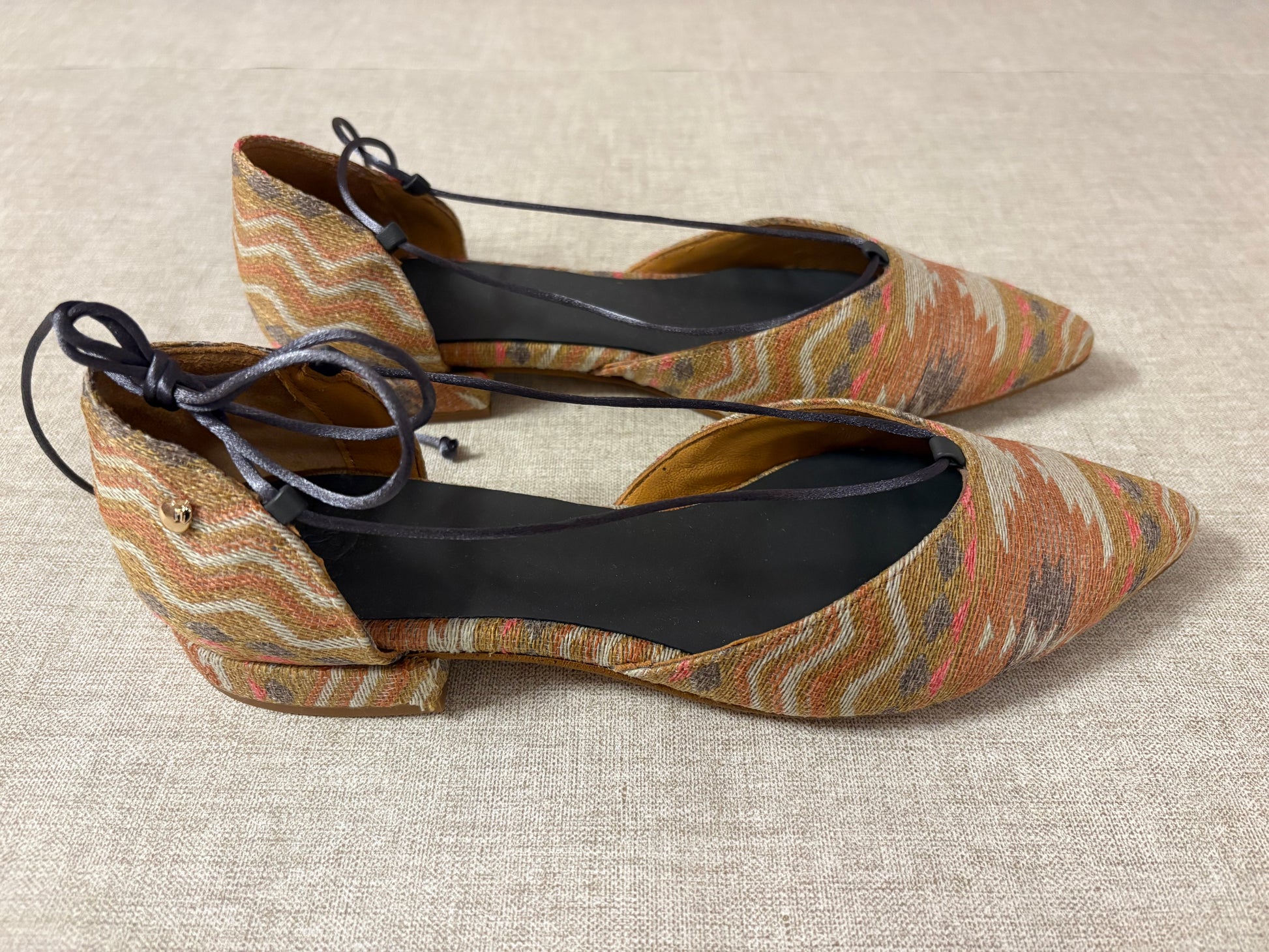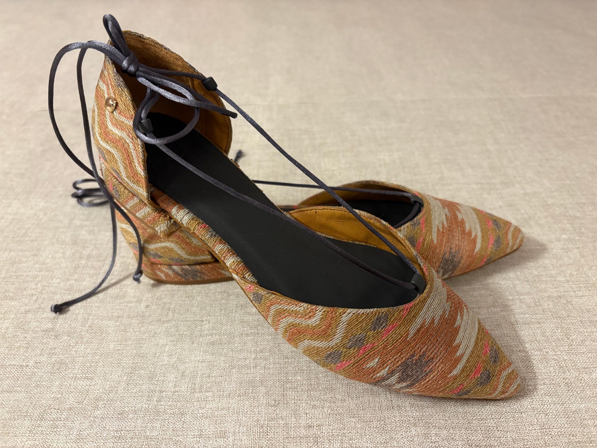 ZAPATO PLANO CON TIRAS EN COLOR GRIS ABIERTO CON TEJIDO ESTAMPADO IKATS Y DETALLES EN PIEL GRIS. TACON DE 2.8CM.