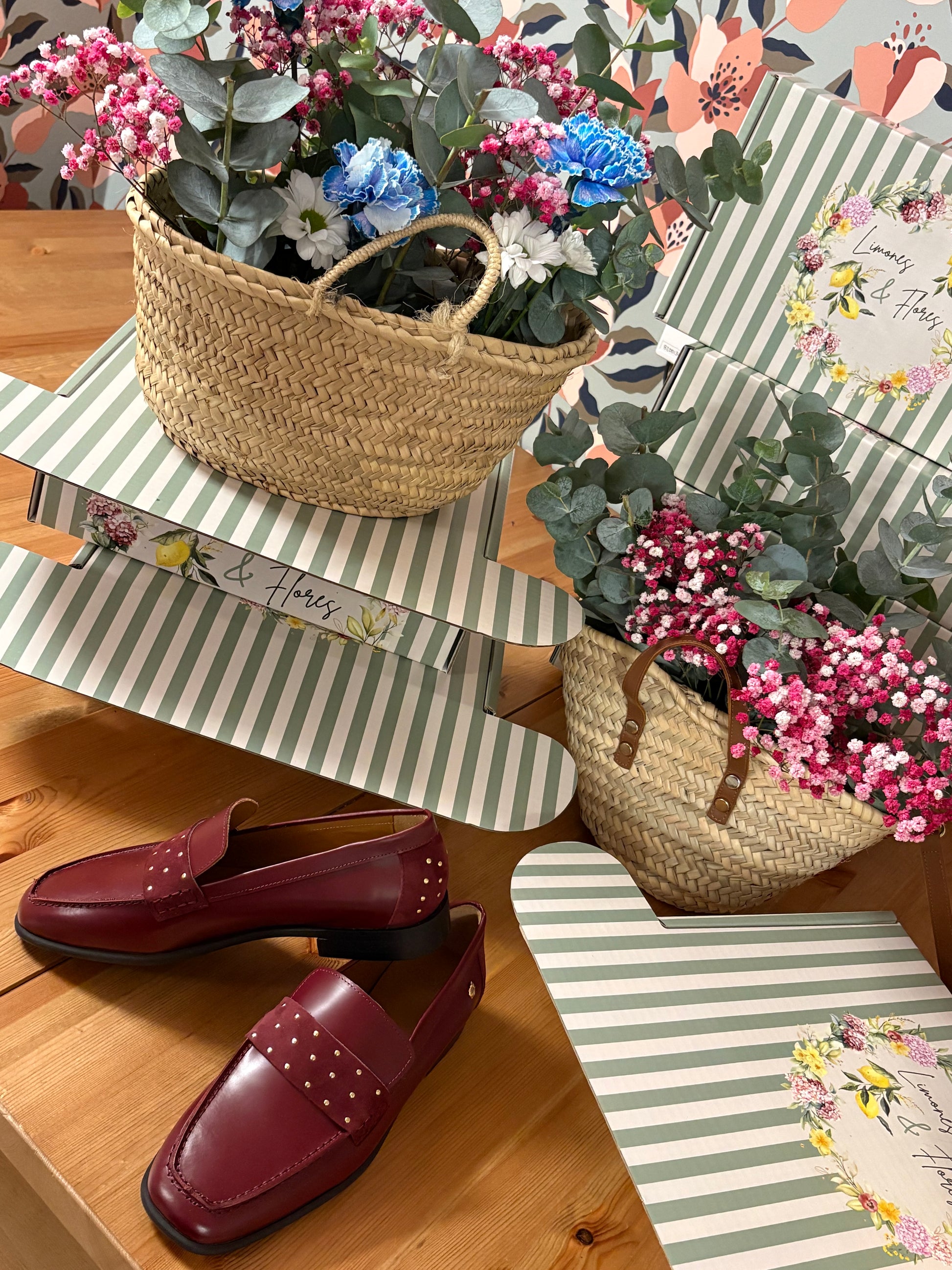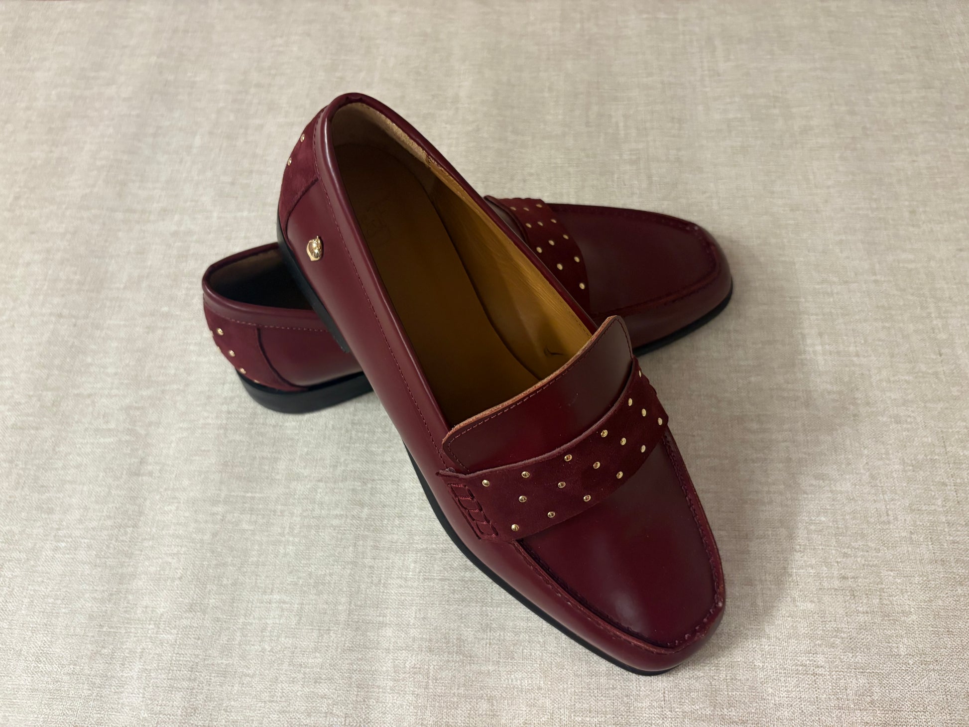 MOCASIN EN PIEL BURDEOS, TIRA DELANTERA Y TALON COMBINADO EN PIEL DE ANTE BURDEOS Y MICRO TACHUELAS DORADAS.